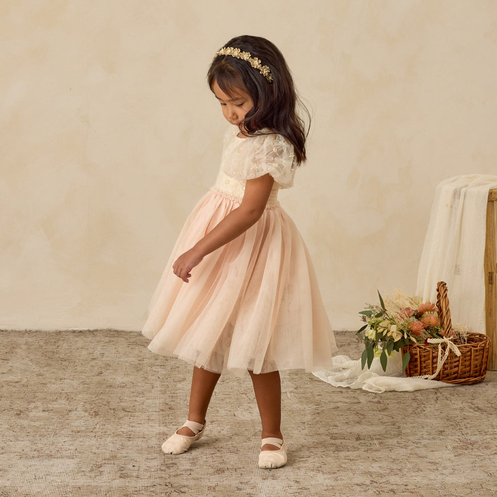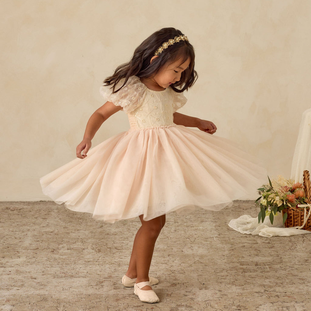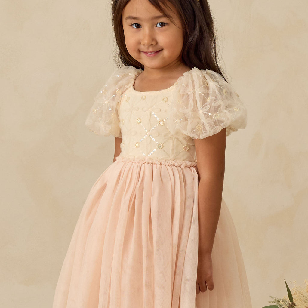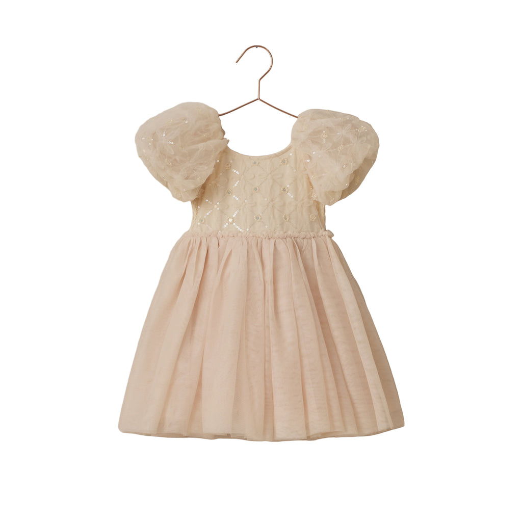 The Dorothy Dress features a delicately embroidered bodice with subtle sequins, voluminous puff sleeves in airy tulle, and a softly gathered skirt that creates a dreamy silhouette. With its whimsical sparkle and fairytale charm, it’s a picture-perfect choice for holiday celebrations and special occasions.