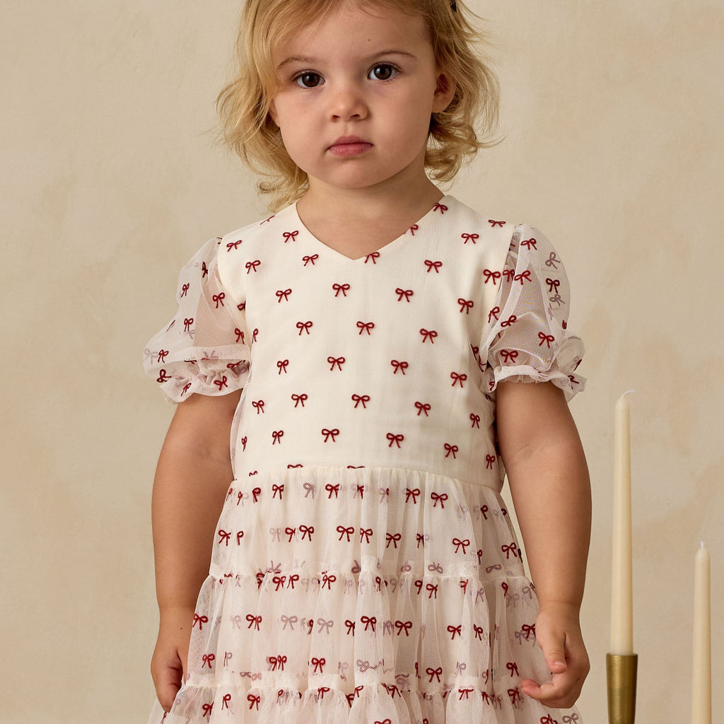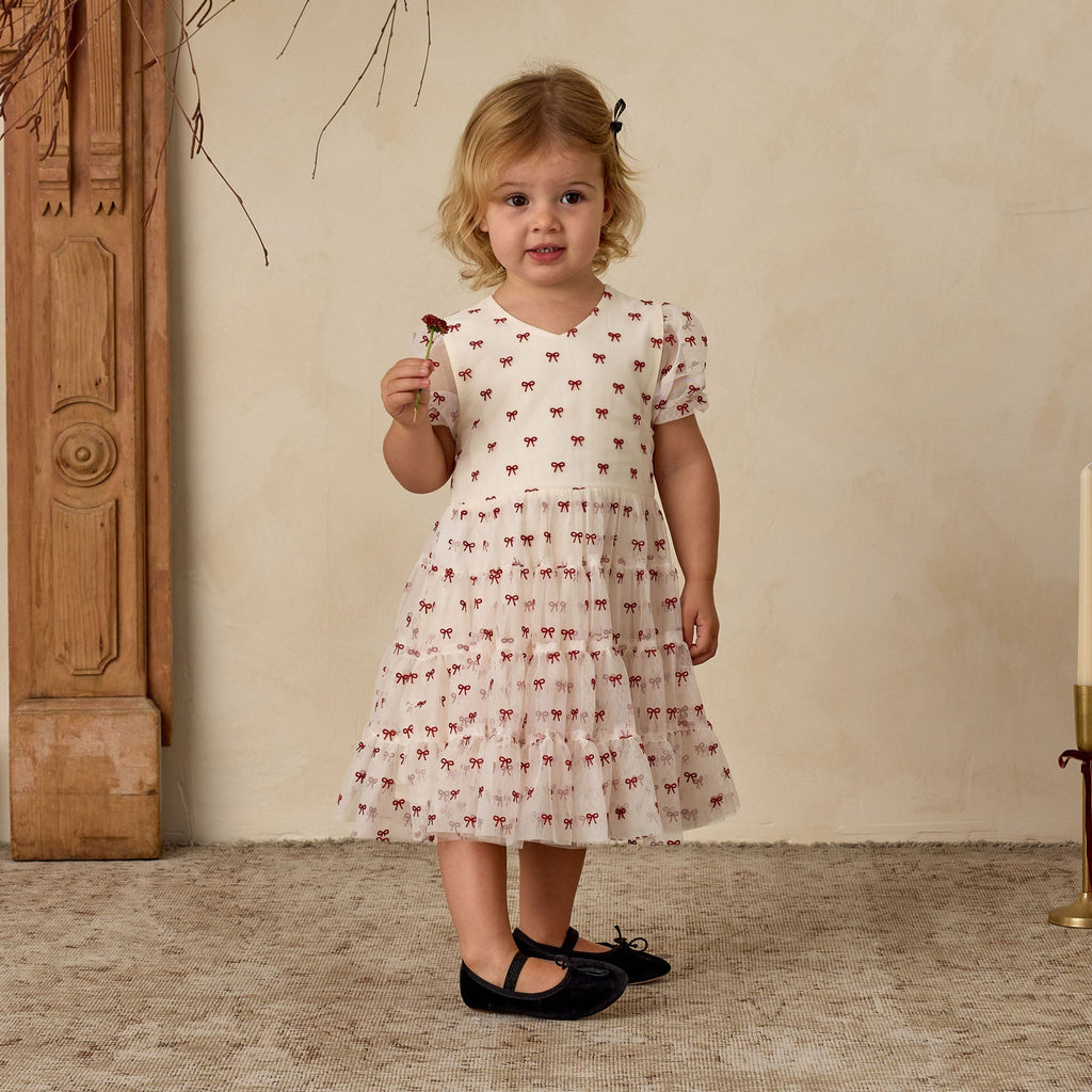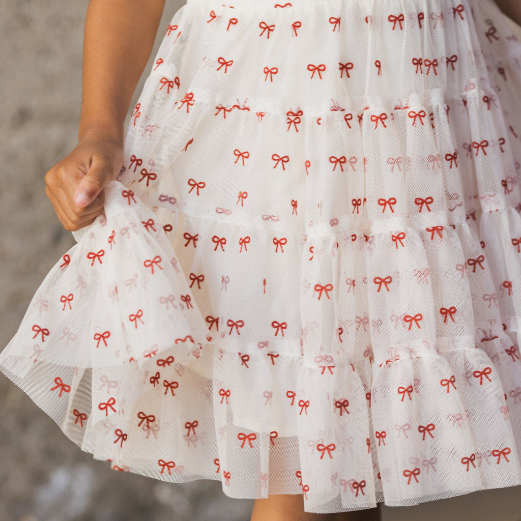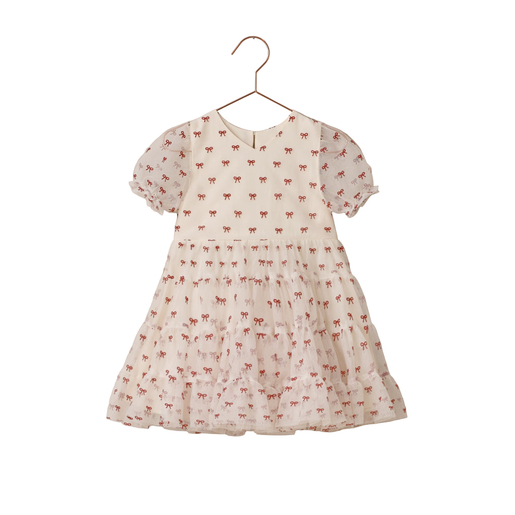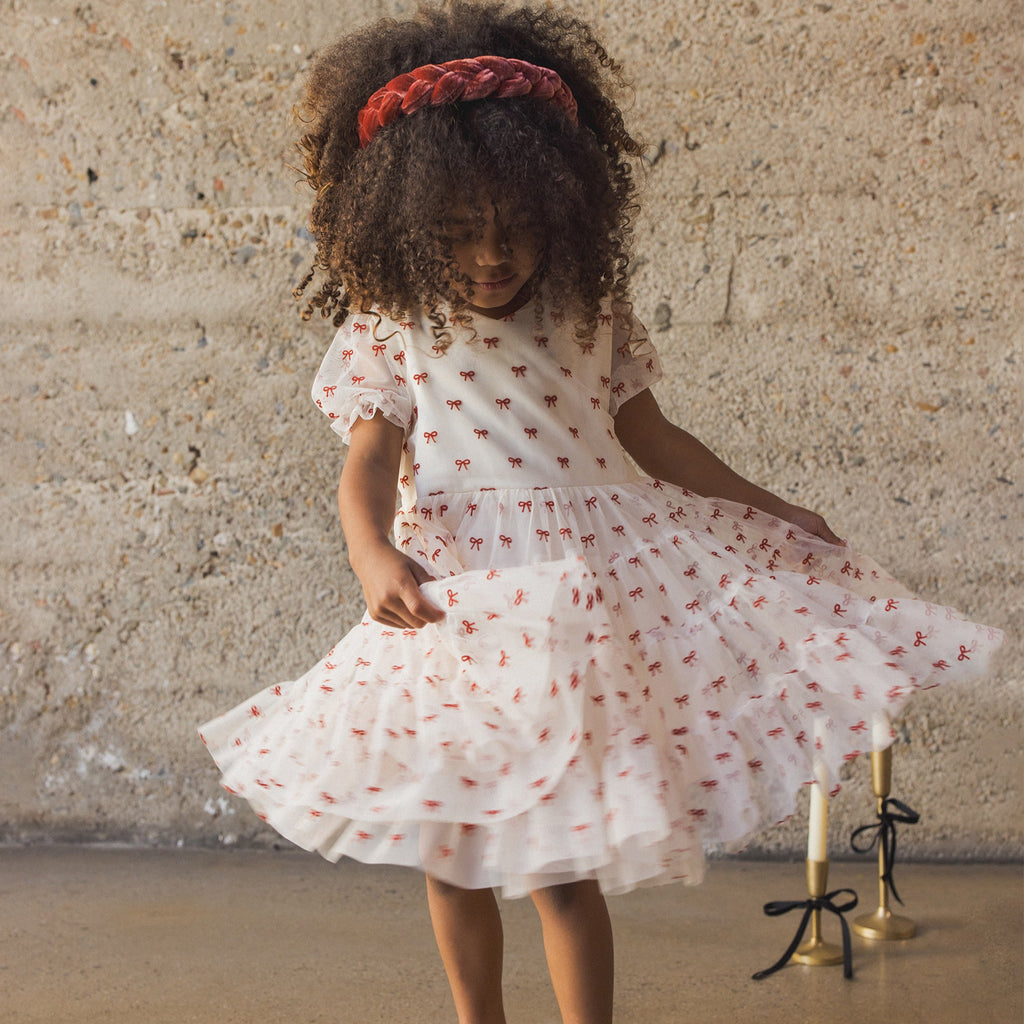 This dreamy midi-length dress is crafted from flocked dotted tulle and features a four-tiered skirt made for twirling, full puffed sleeves, and a delicate button-back closure. Coordinating bloomers included with size 2Y.